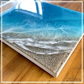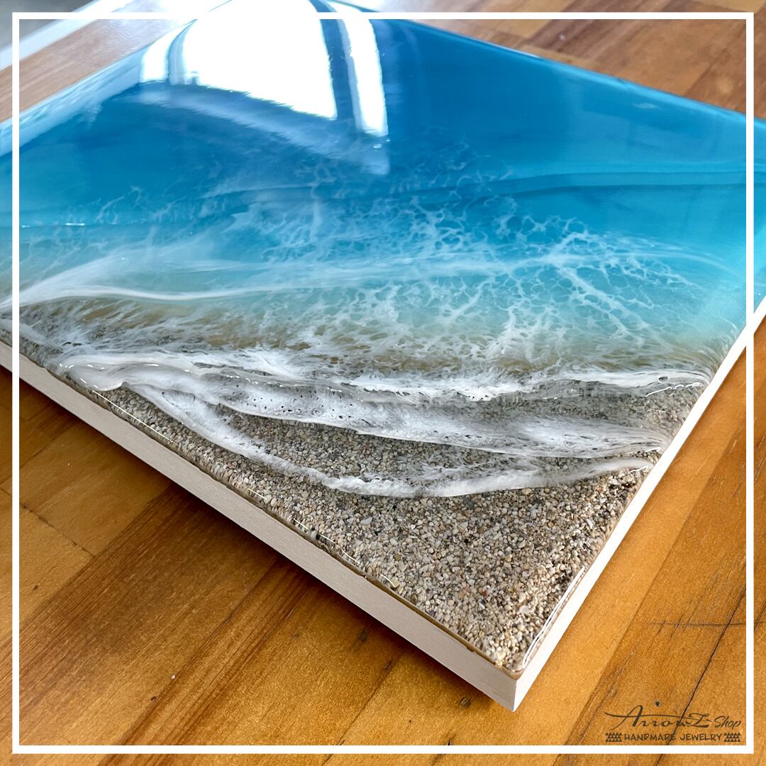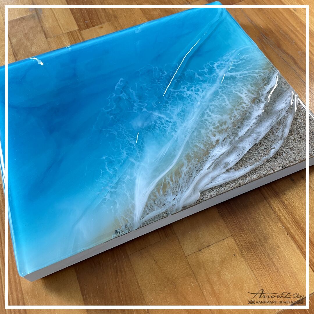 木製パネル(シナベニヤ)に下地材を塗り、エポキシ樹脂を数日かけて何層も重ね、丁寧に海と波を描いてます。
