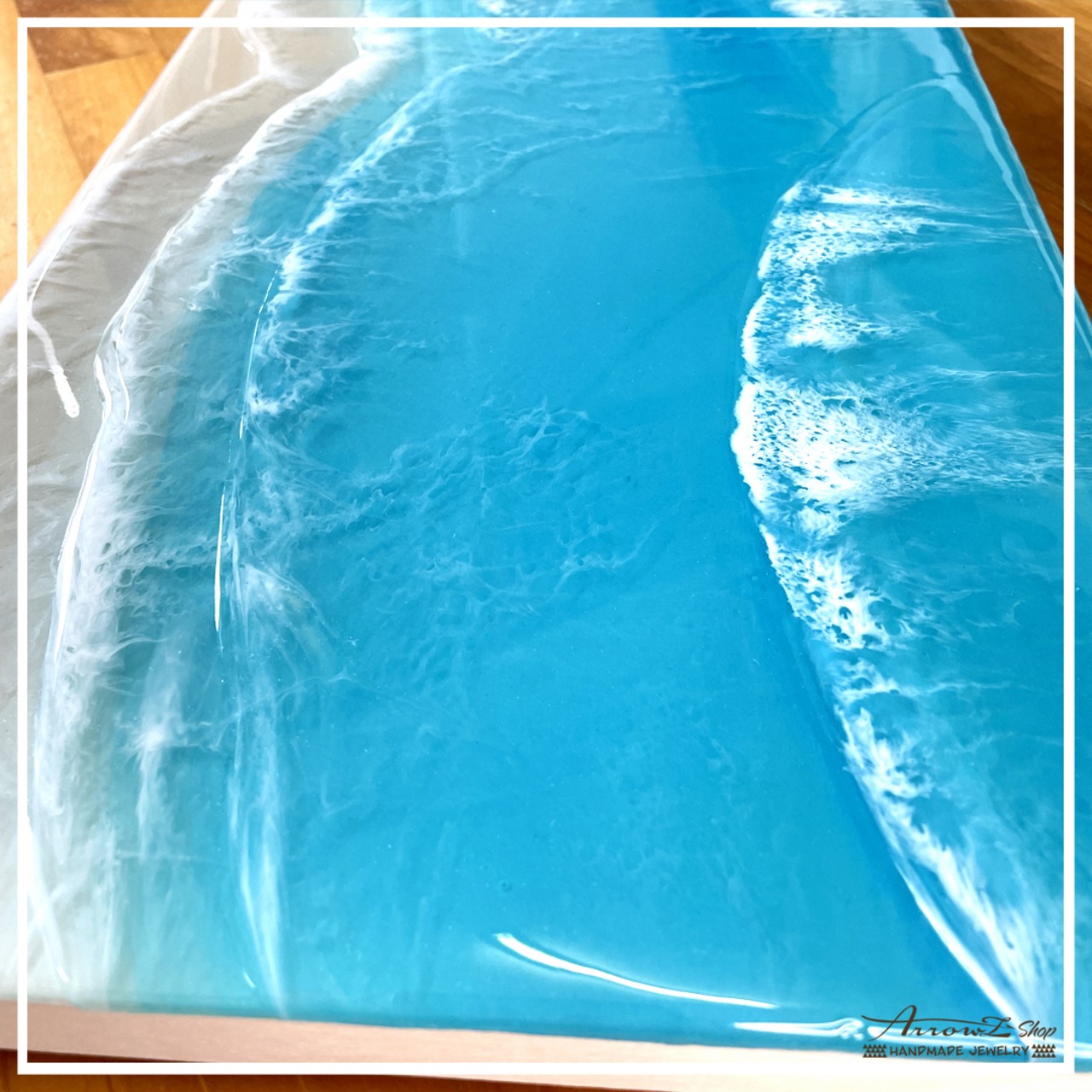 木製パネル(シナベニヤ)に下地材を塗り、エポキシ樹脂を数日かけて何層も重ね、丁寧に海と波を描いてます。