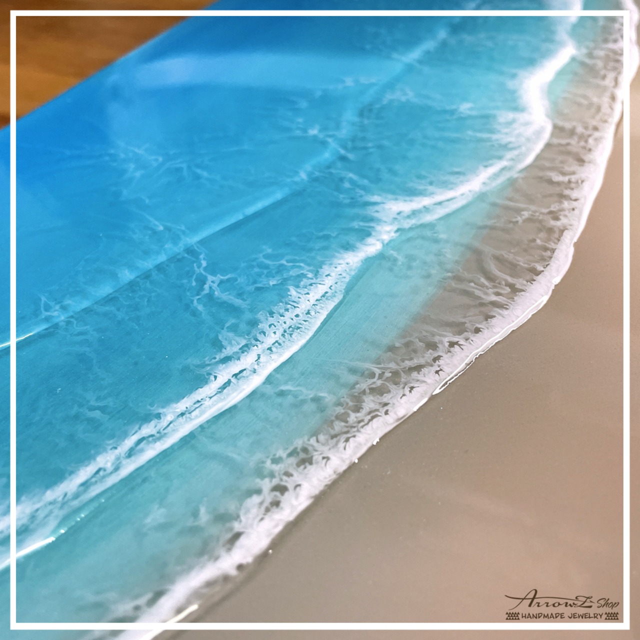 木製パネル(シナベニヤ)に下地材を塗り、エポキシ樹脂を数日かけて何層も重ね、丁寧に海と波を描いてます。