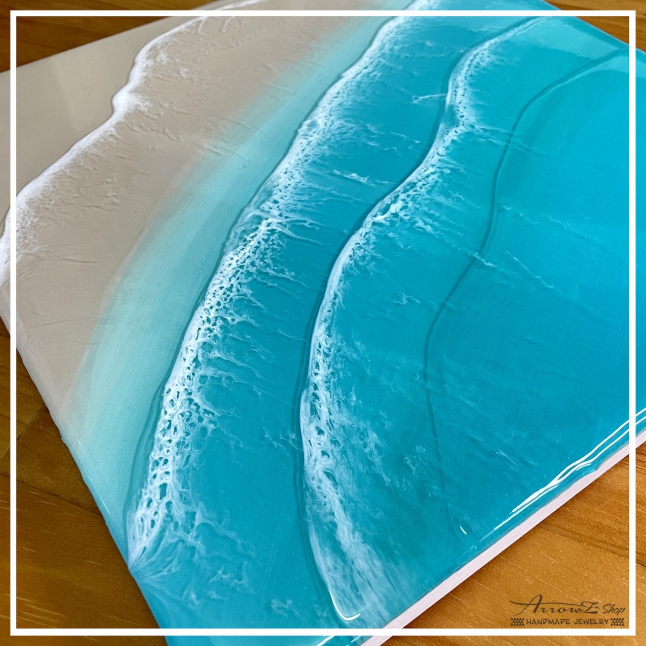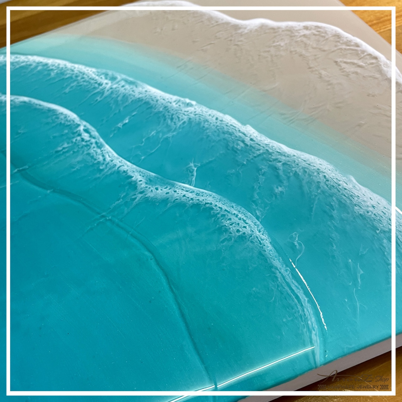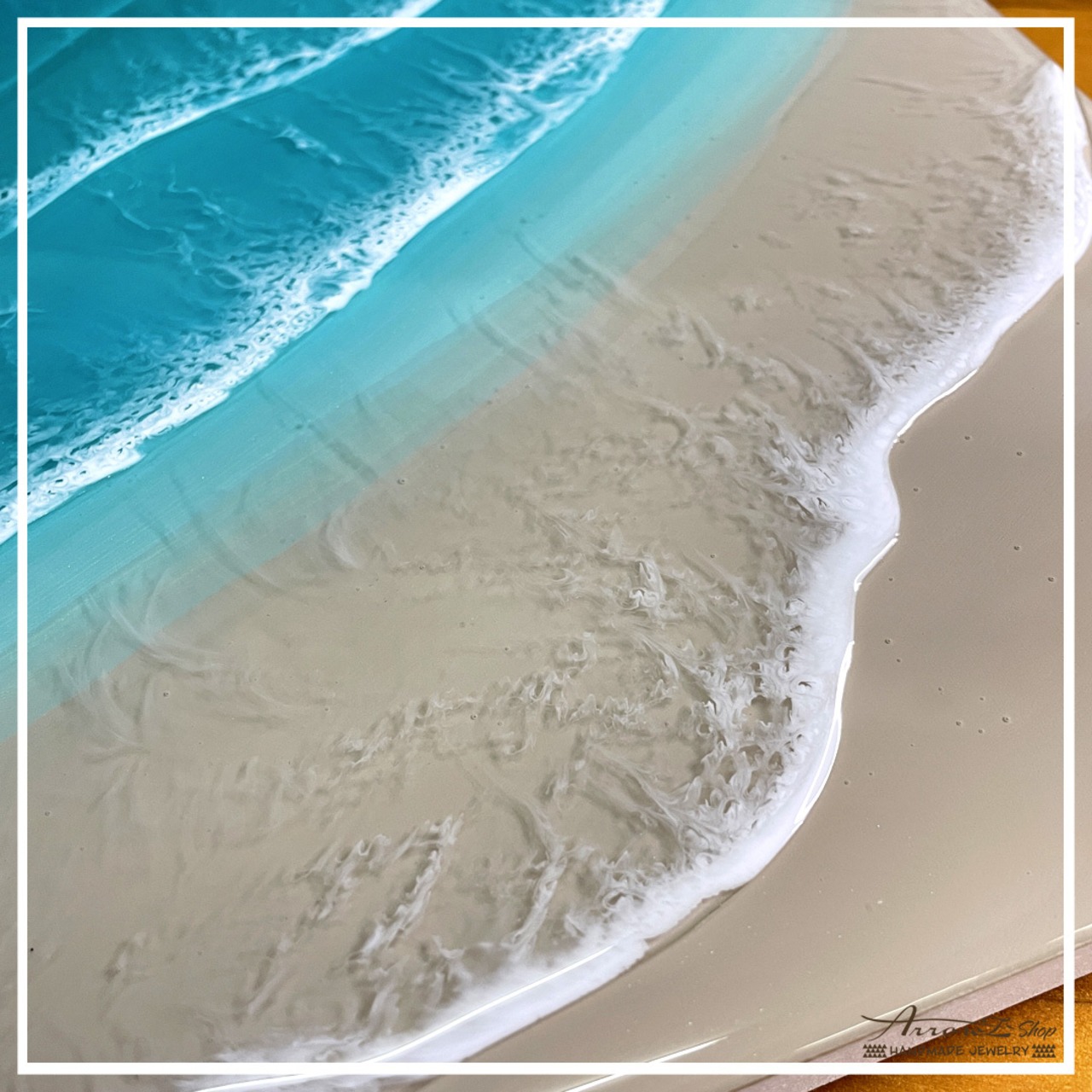 木製パネル(シナベニヤ)に下地材を塗り、エポキシ樹脂を数日かけて何層も重ね、丁寧に海と波を描いてます。