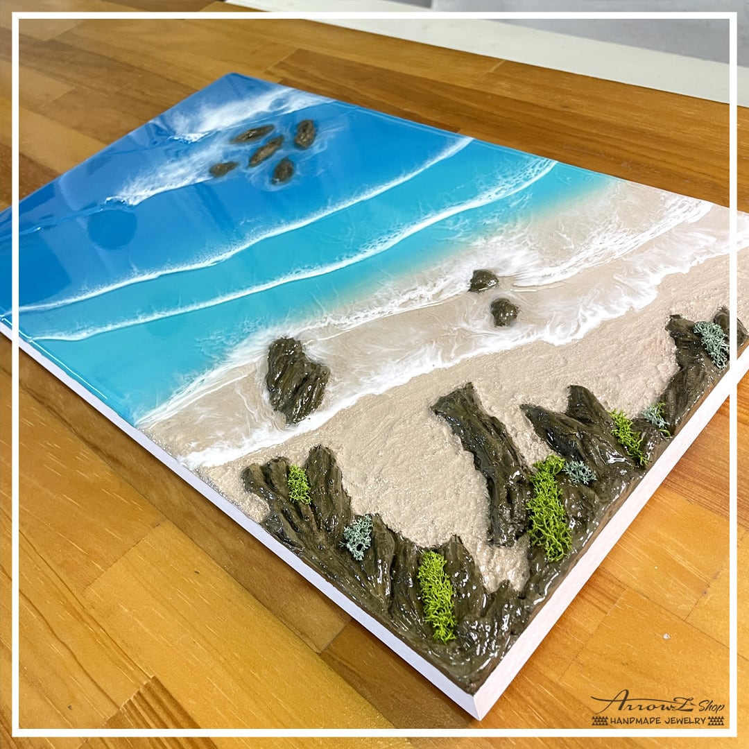 木製パネル(シナベニヤ)に下地材を塗り、エポキシ樹脂を数日かけて何層も重ね、丁寧に海と波を描いてます。
