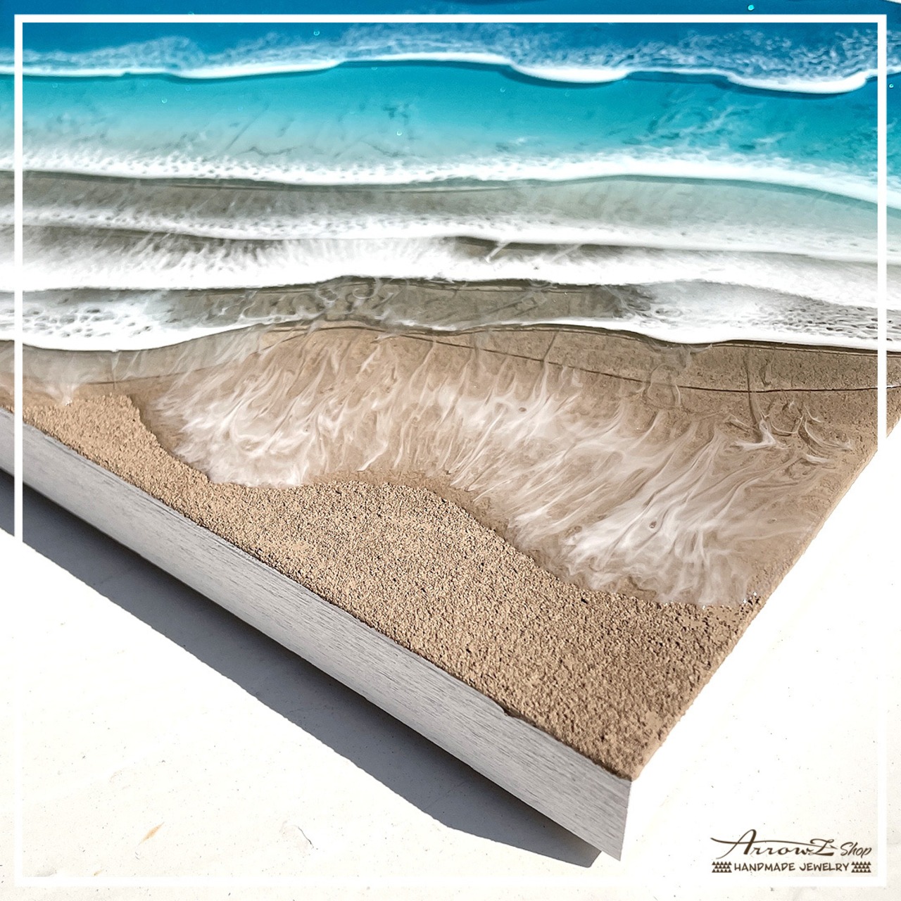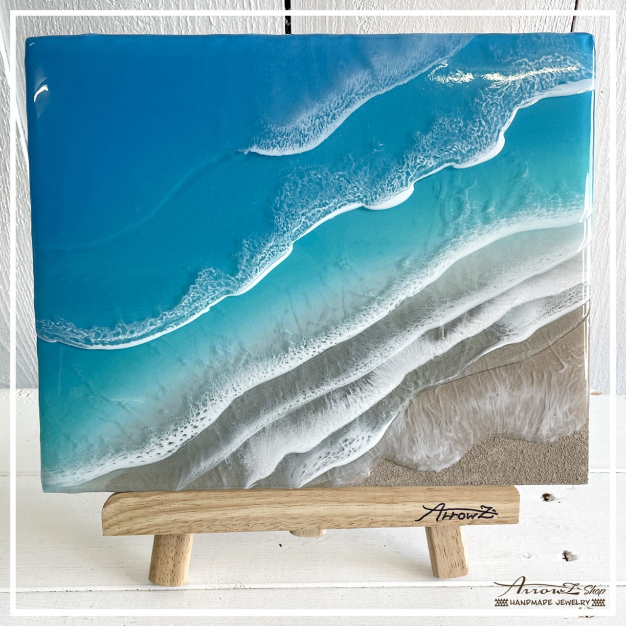 木製パネル(シナベニヤ)に下地材を塗り、エポキシ樹脂を数日かけて何層も重ね、丁寧に海と波を描いてます。