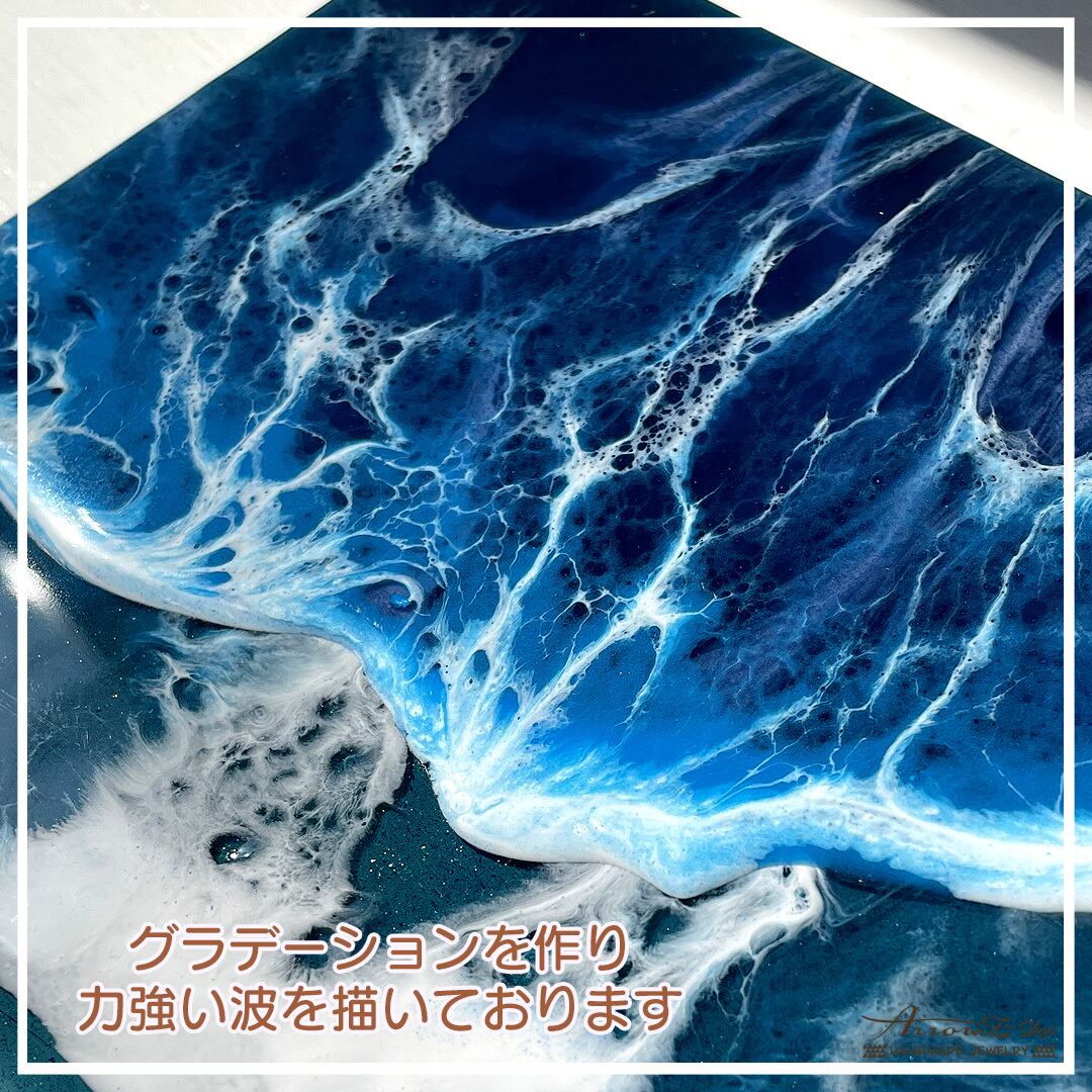 木製パネル(シナベニヤ)に下地材を塗り、エポキシ樹脂を数日かけて何層も重ね、丁寧に海と波を描いてます。