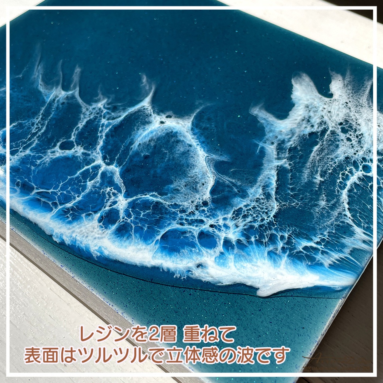 木製パネル(シナベニヤ)に下地材を塗り、エポキシ樹脂を数日かけて何層も重ね、丁寧に海と波を描いてます。