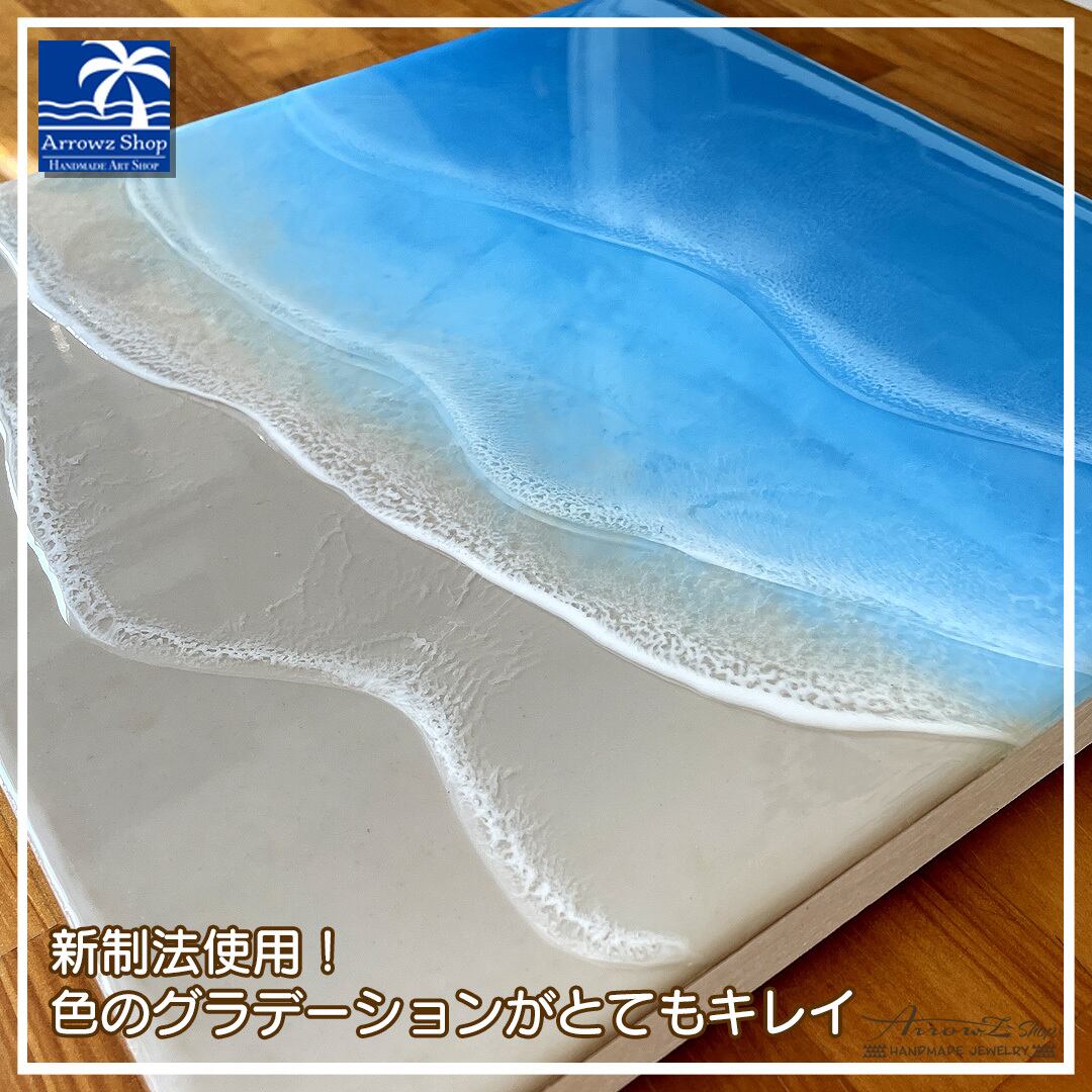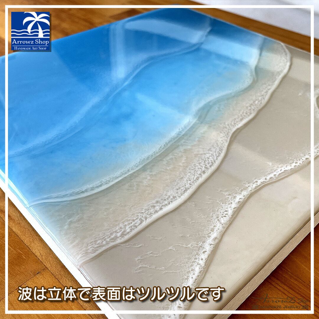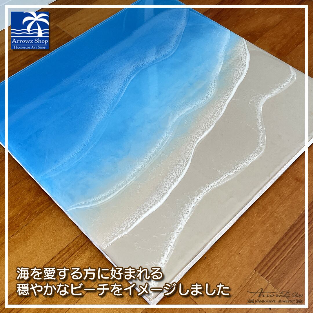 木製パネル(シナベニヤ)に下地材を塗り、エポキシ樹脂を数日かけて何層も重ね、丁寧に海と波を描いてます。