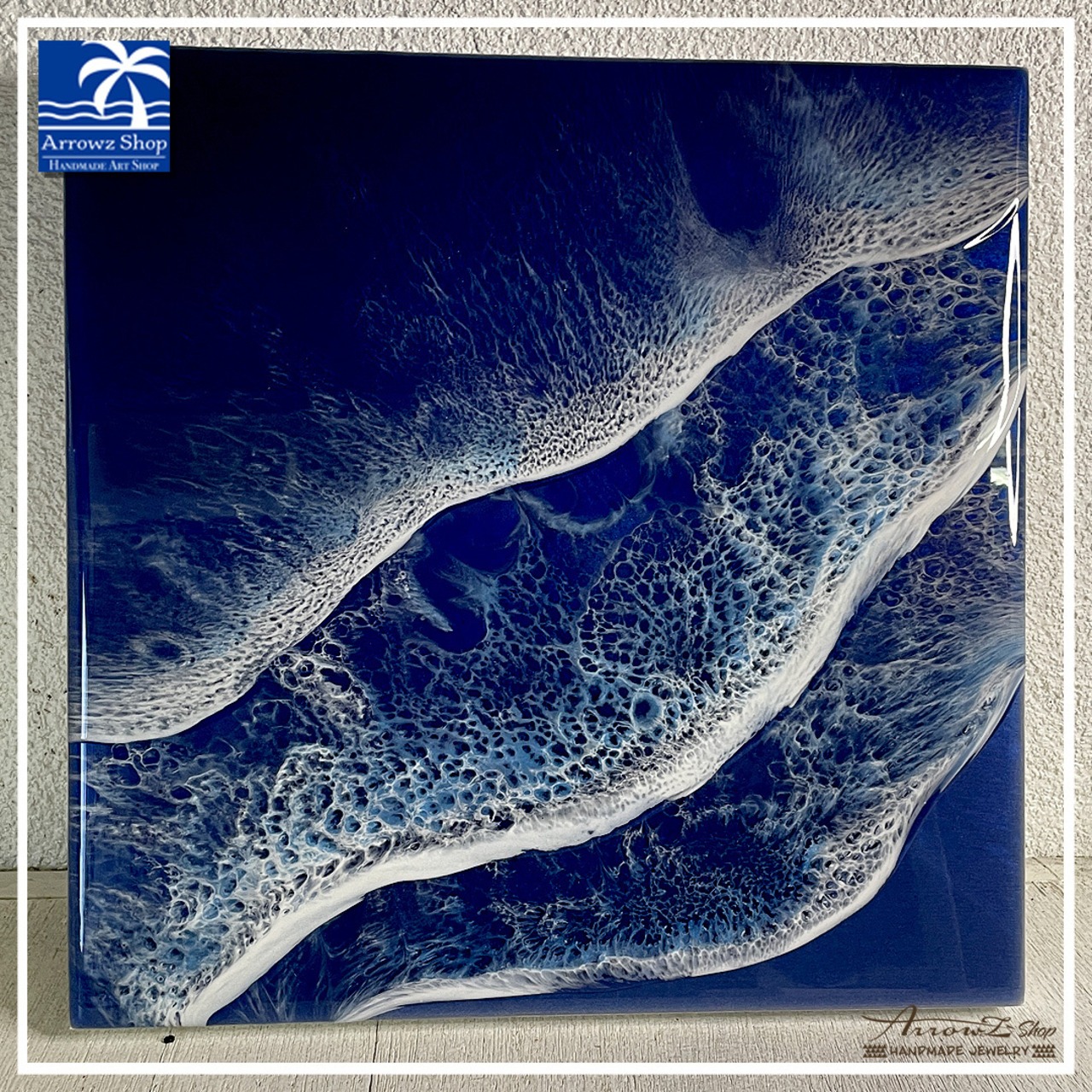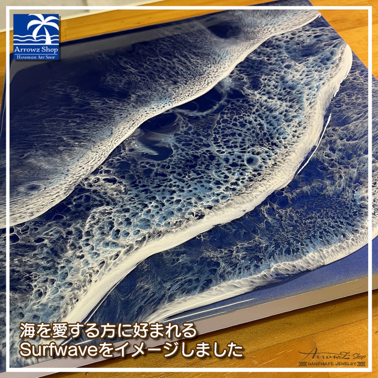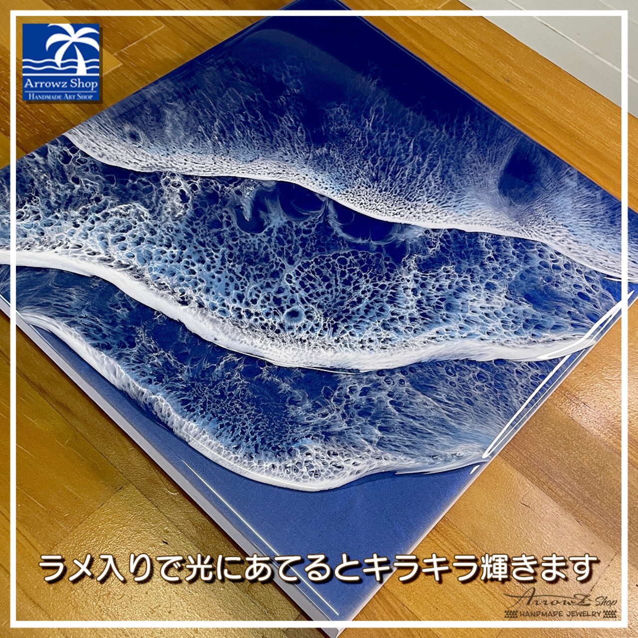 木製パネル(シナベニヤ)に下地材を塗り、エポキシ樹脂を数日かけて何層も重ね、丁寧に海と波を描いてます。