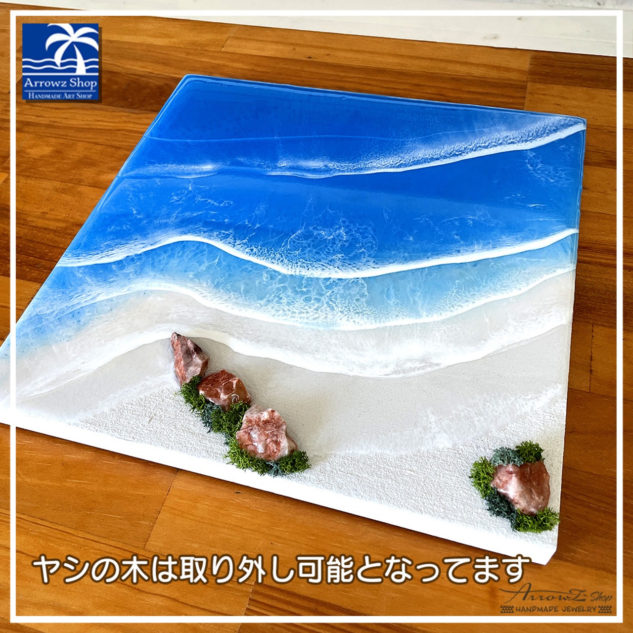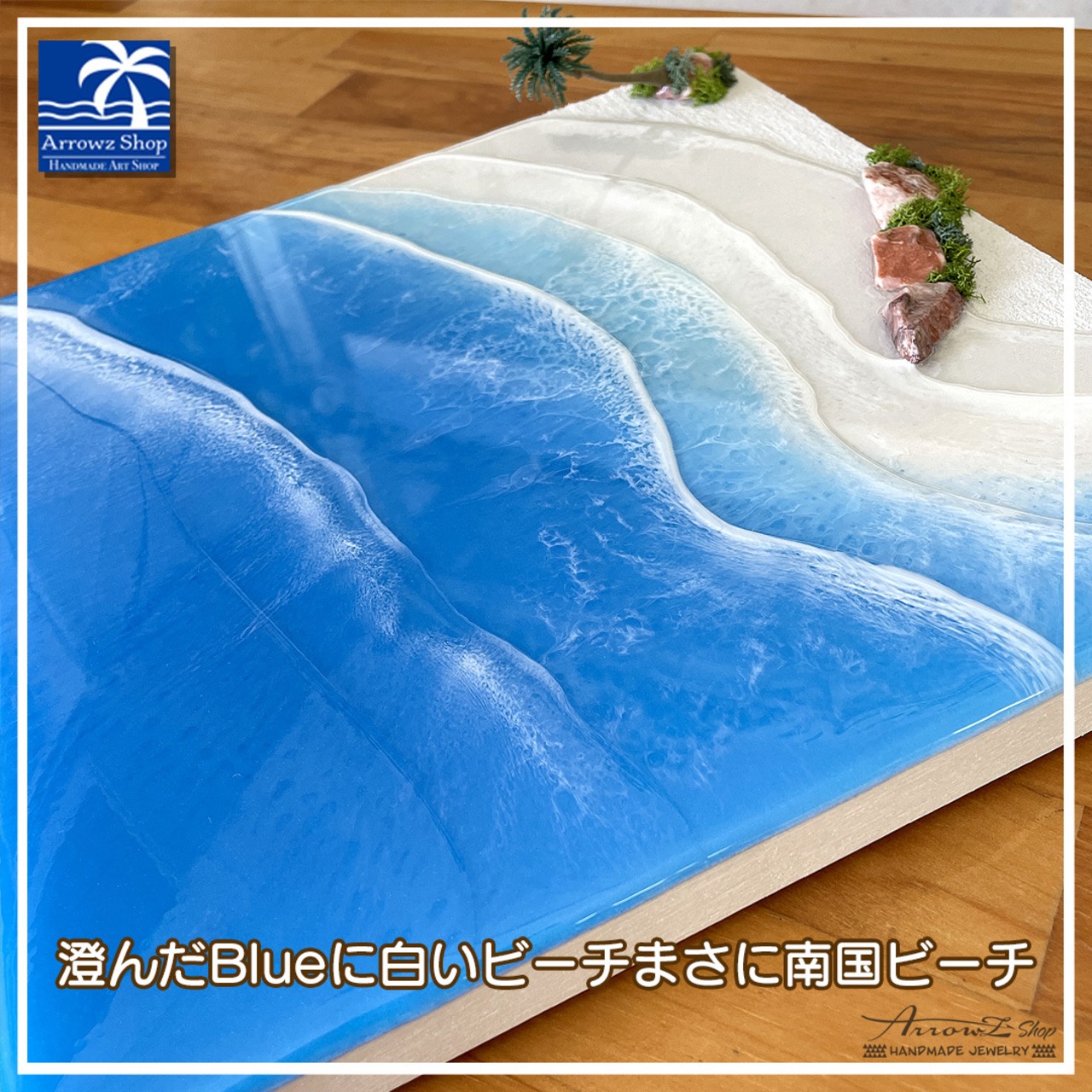木製パネル(シナベニヤ)に下地材を塗り、エポキシ樹脂を数日かけて何層も重ね、丁寧に海と波を描いてます。
