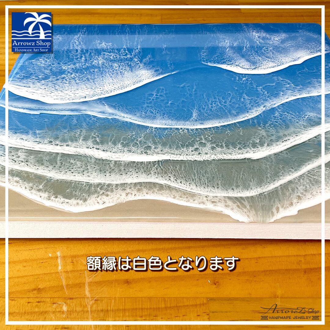 木製パネル(シナベニヤ)に下地材を塗り、エポキシ樹脂を数日かけて何層も重ね、丁寧に海と波を描いてます。