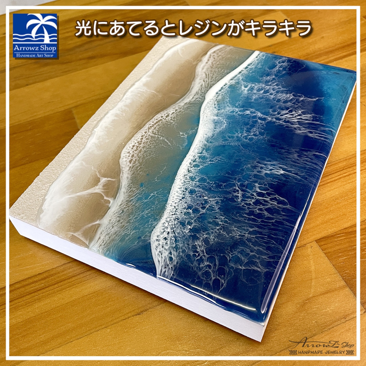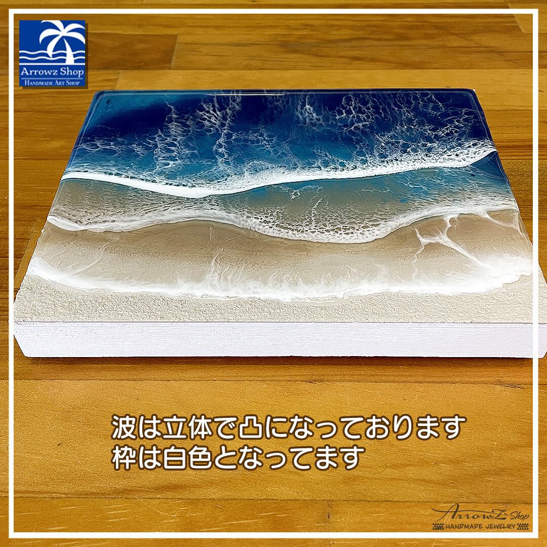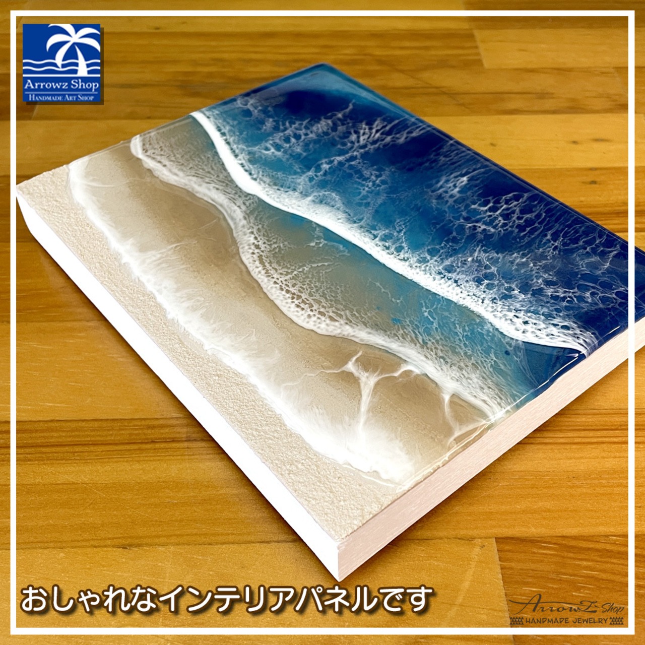 木製パネル(シナベニヤ)に下地材を塗り、エポキシ樹脂を数日かけて何層も重ね、丁寧に海と波を描いてます。