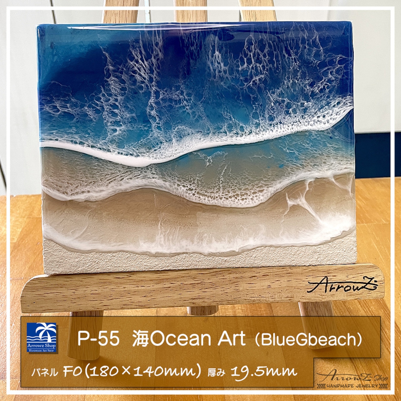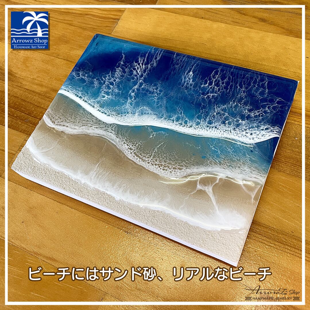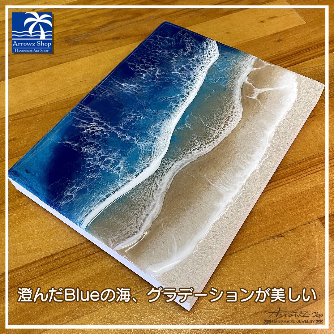 木製パネル(シナベニヤ)に下地材を塗り、エポキシ樹脂を数日かけて何層も重ね、丁寧に海と波を描いてます。