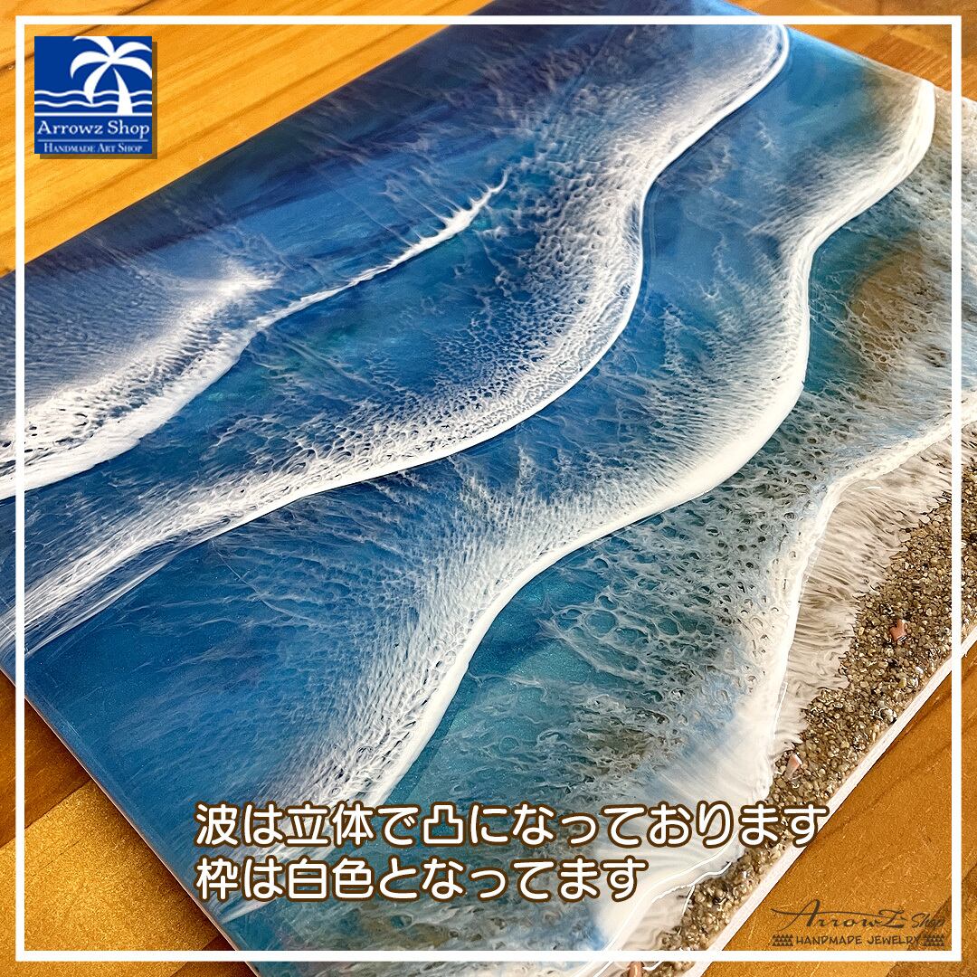 木製パネル(シナベニヤ)に下地材を塗り、エポキシ樹脂を数日かけて何層も重ね、丁寧に海と波を描いてます。