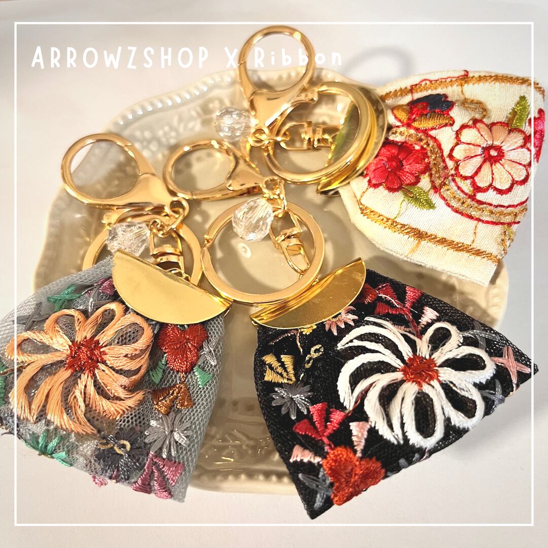 こちらは話題のインド刺繍リボンのキーホルダーです