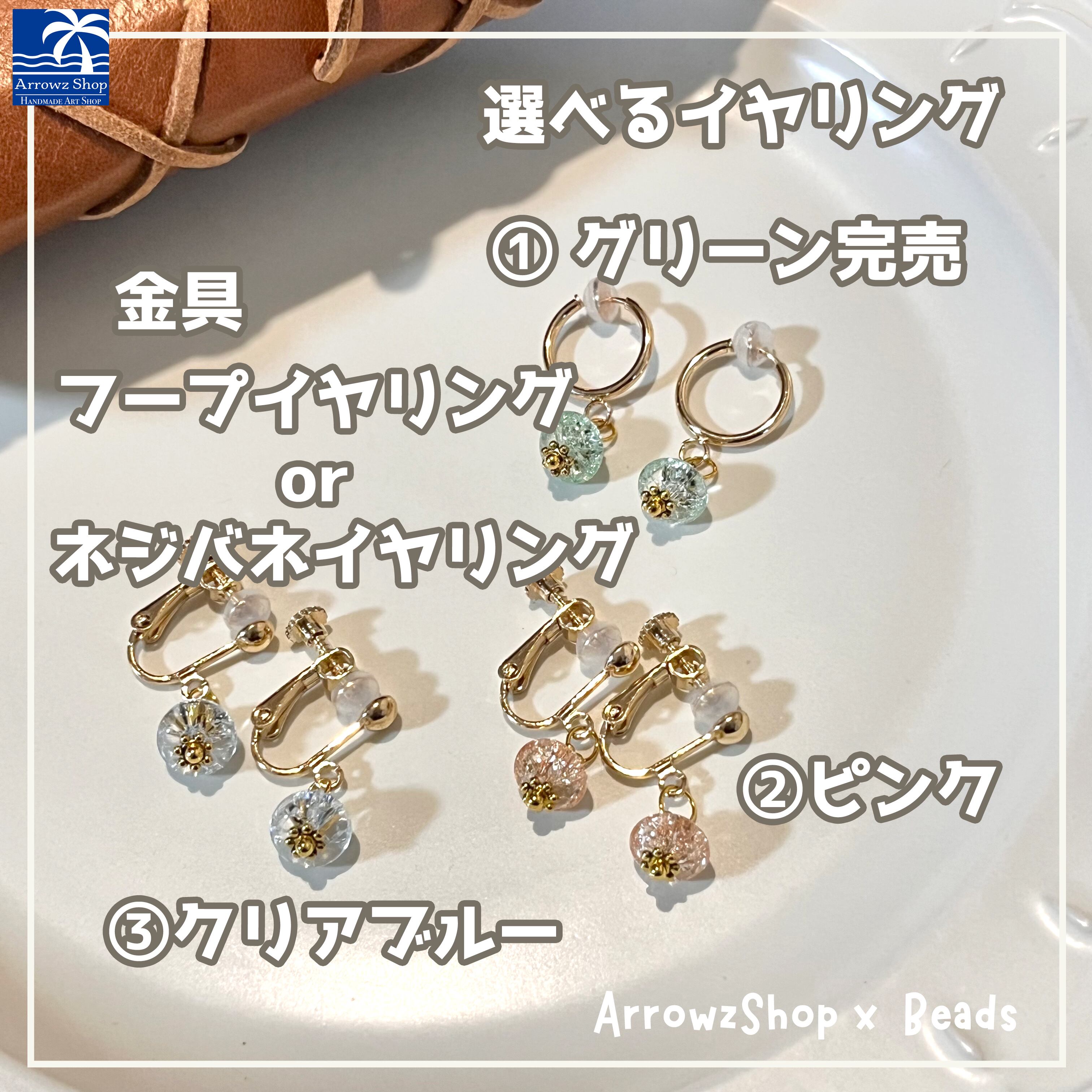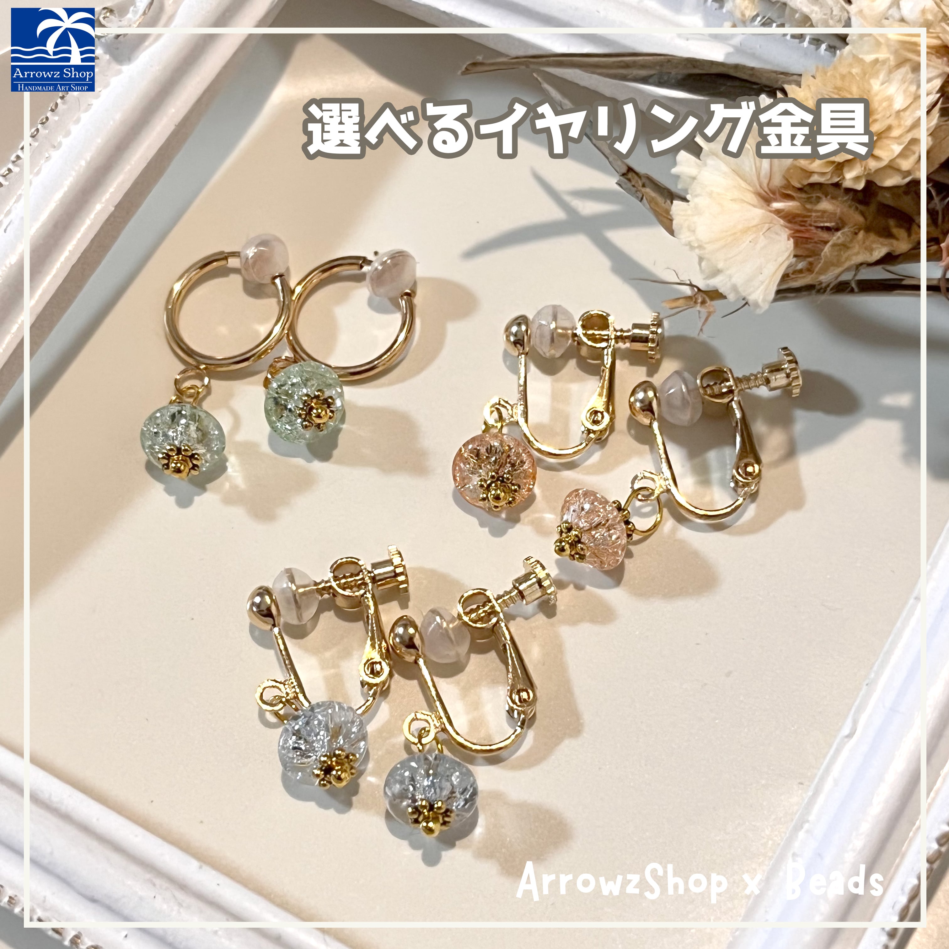 お好みのイヤリング金具とビーズのお色をお選びいただくオーダーイヤリングとなっております